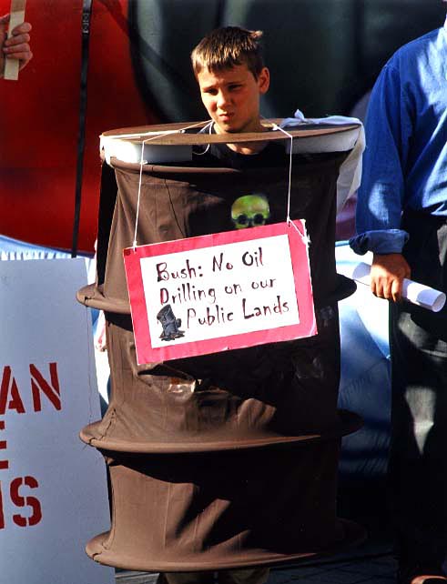 A young protestor at the Bush Administration's west coast Energy Policy Hearing in Seattle expresses his views on drilling for oil on the Arctic National Wildlife Refug and other publicly owned lands. |